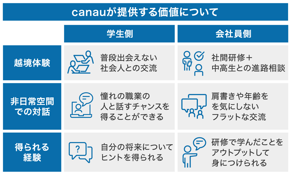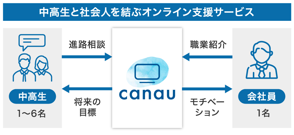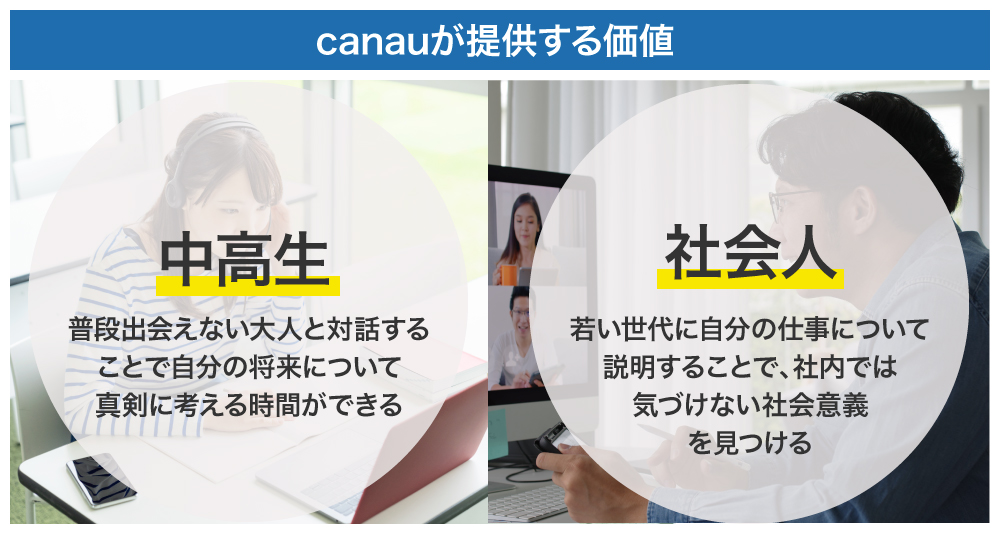 弊社は、前述した企業や教育現場が持つ課題を解決に導くためのサービス「canau」を開発しました。本サービスは、社会人と中高生がオンラインでグループディスカッションすることで気づきを得るサービスです。