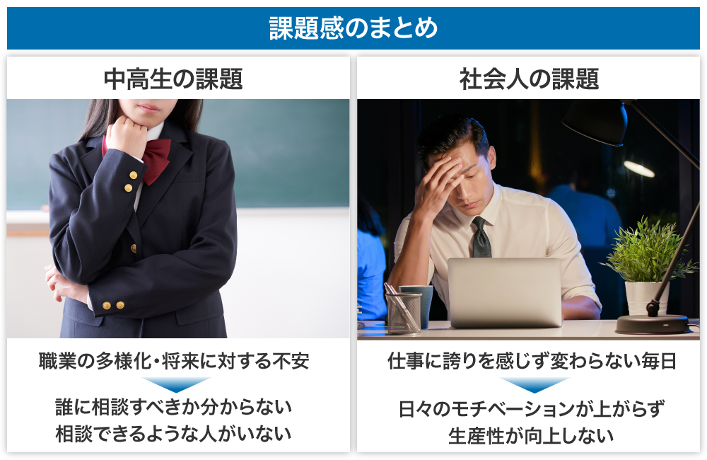 刻一刻と社会が進歩していく中、中高生の将来の進路も多様化が進みます。それにより、進路指導を行う現場でも課題が生まれていると感じます。それは、職業の変化と多様化から相談を受ける両親や先生が対応しきれなくなってきているのではないかという点です。
