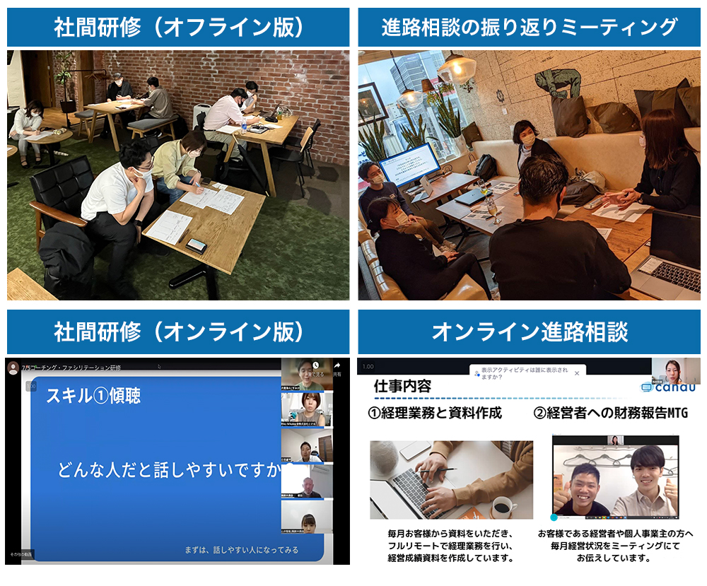 進路相談当日を迎えるまでにサポーターの方々には、「社間研修」と名付けたオンライン・オフラインを交えた異なる業種の人と共にロールプレイングやペアワークを中心とした実践的な研修を受けていただいています。