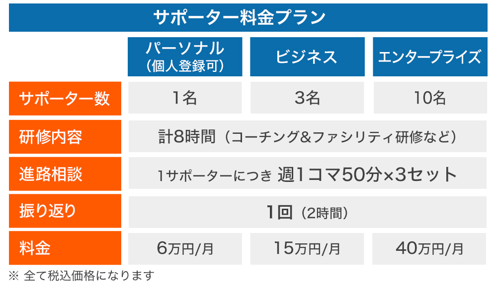 企業に対しては、サポーターへの研修から研修後の振り返りまでの全プログラムを一貫して受けられるパックとして販売しています。