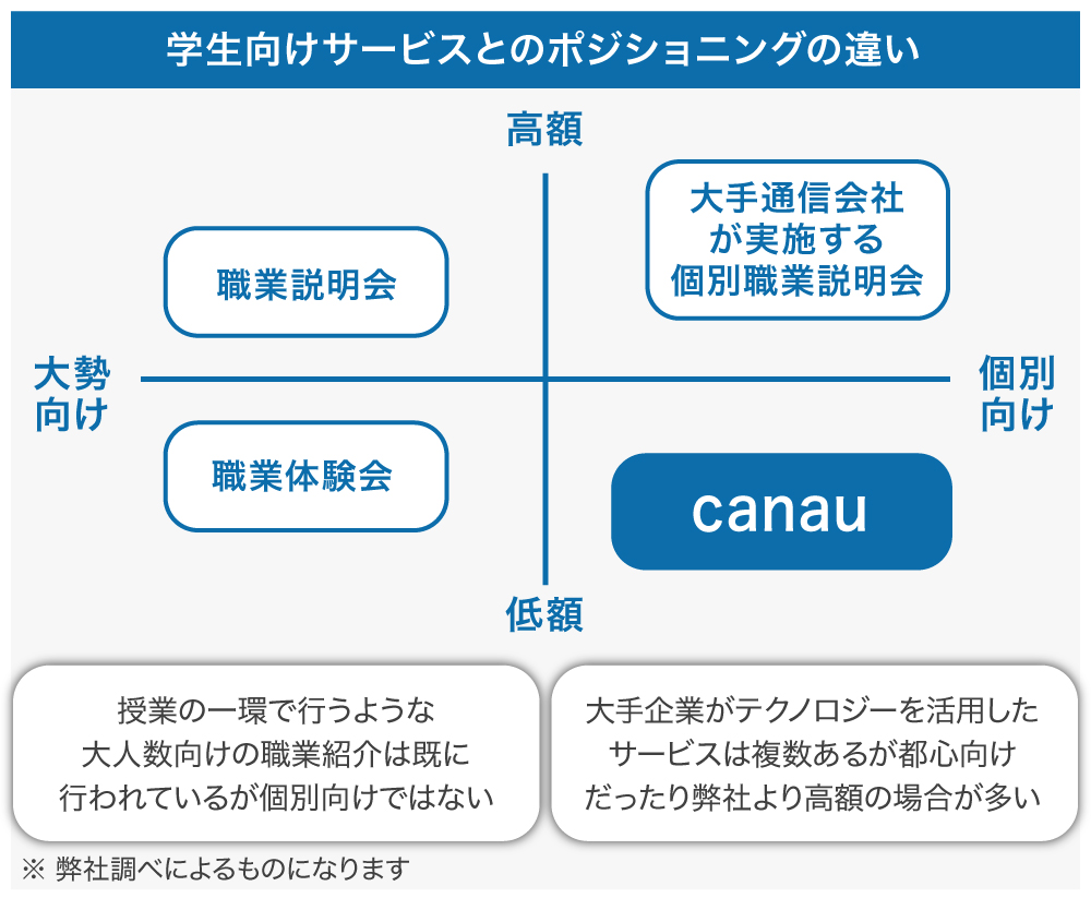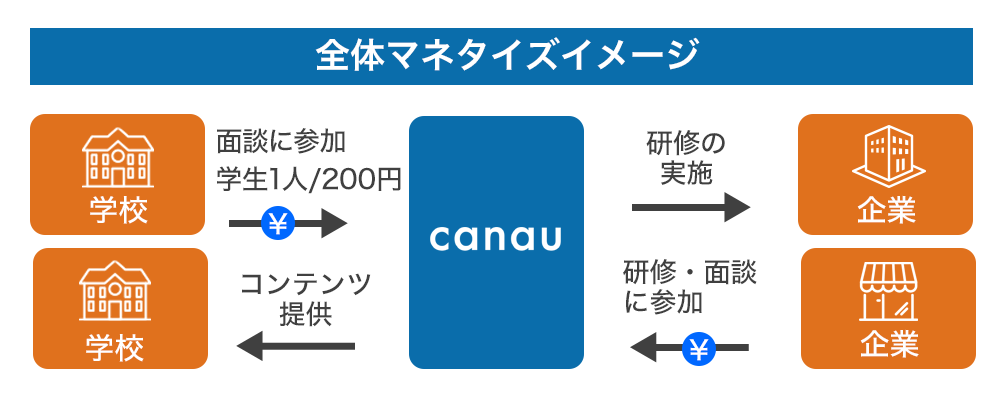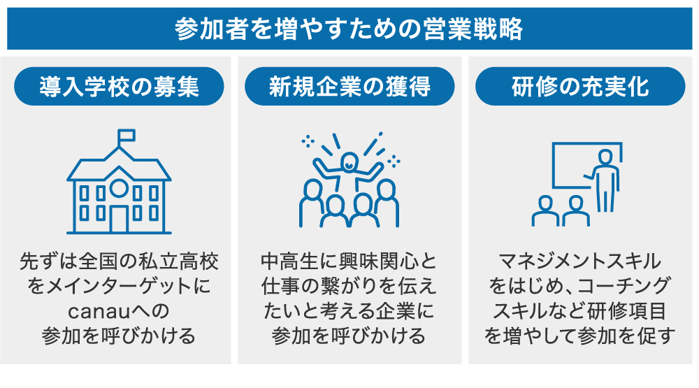 「canau」を成長させるには、導入校と企業の獲得が必要です。まず、導入校については、弊社代表が元教師であることから、学校とのネットワークもあり、既に加入を待っていただいている状態です。