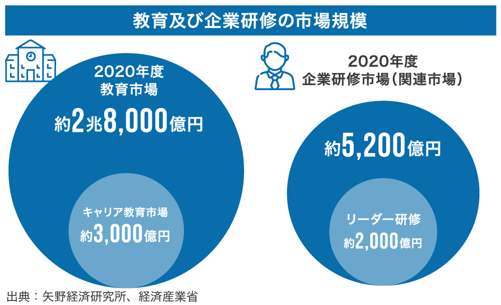国内の教育産業全体の市場規模は年間約2.8兆円にのぼります(出典:矢野経済研究所)。弊社は、小回りのきく手厚い研修内容で、全国の学生や社会人のキャリア教育を支援することで、市場のさらなる活性化を目指します。