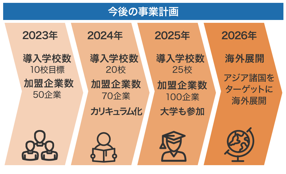 そして2024年には、特別授業として学校に時間を確保してもらうカリキュラム化を実現したいと考えています。その後は成功事例をもとに、中学校や大学へと導入校を拡大していきたい考えです。