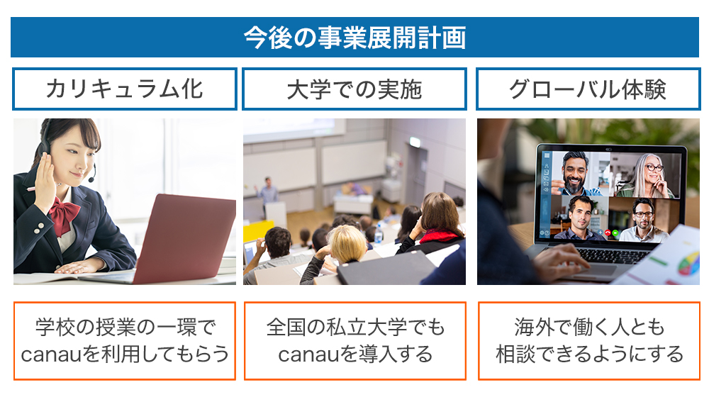 海外でも働く大人と話す機会が少ない国に対して「canau」を展開する計画です。まずは、韓国など受験競争が激しい地域にキャリア教育を取り入れてもらえるようにしていく計画です。
