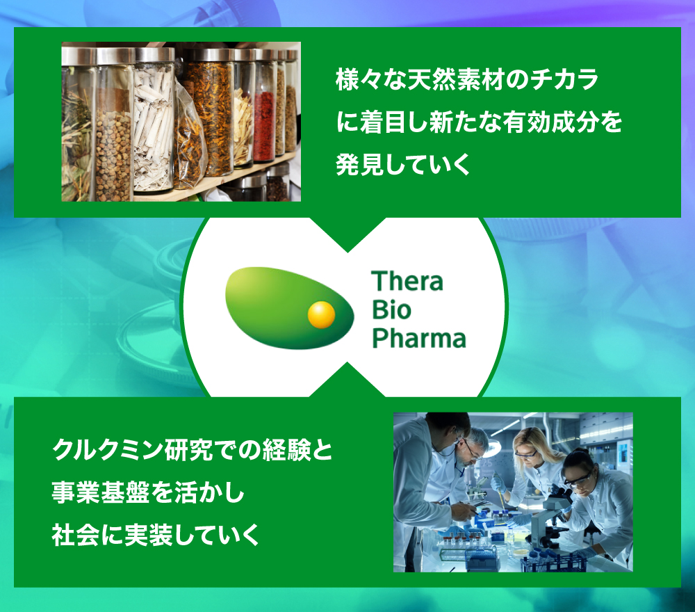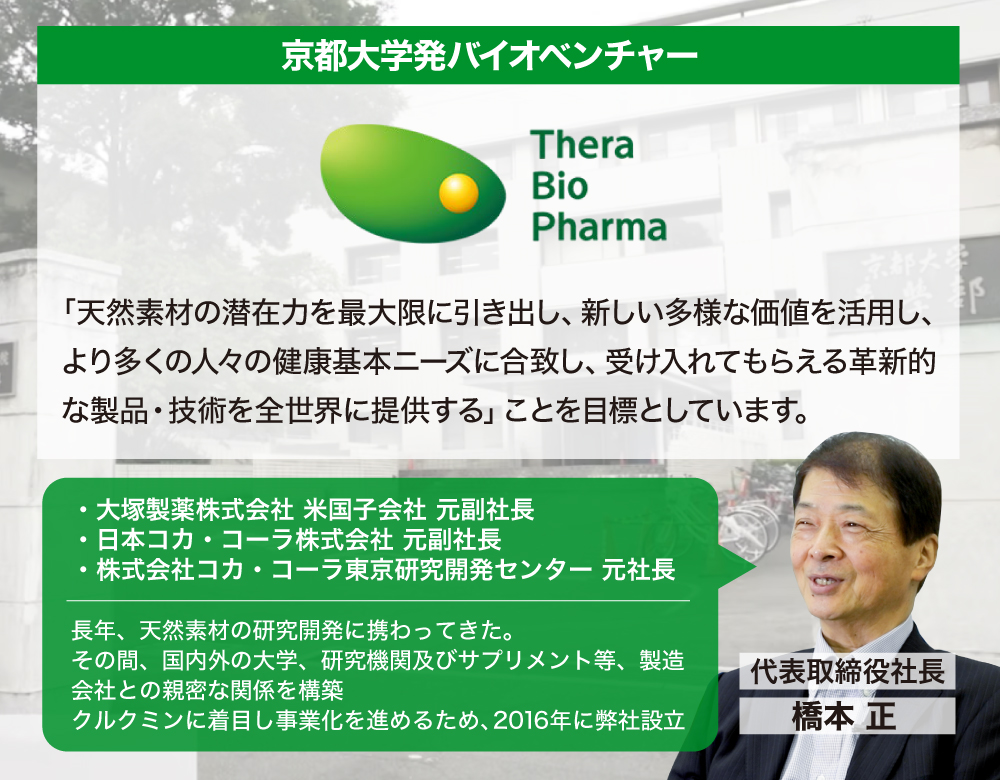 この目的を達成するために京都大学発のバイオベンチャー「株式会社セラバイオファーマ」を設立し、医薬品化を目指す「TBP1901」の研究開発と機能性食品「クルクルージュ」を開発提供しています。