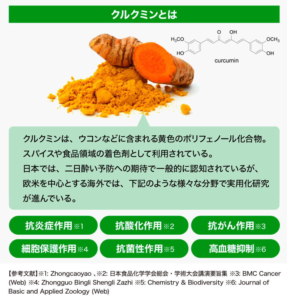 現在は、天然ウコンの主成分である「クルクミン」に着目し、研究開発を進めています。