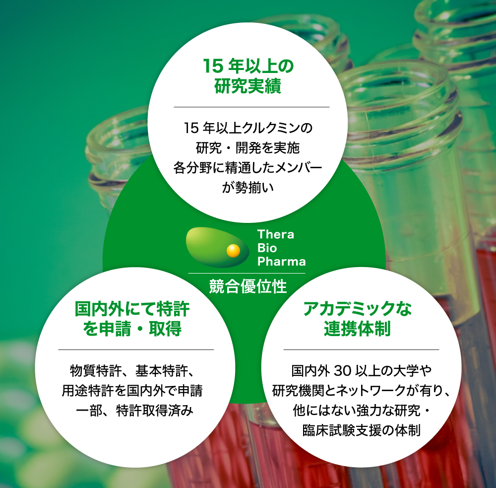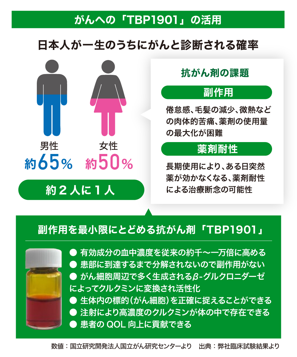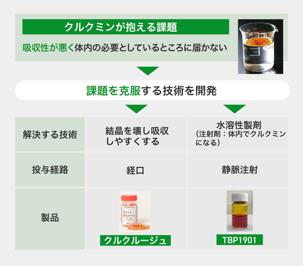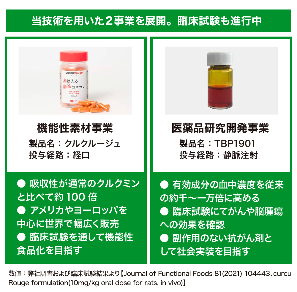 機能性素材として、超高吸収クルクミン製剤「クルクルージュ」の開発に成功し、免疫機能の向上などがヒト臨床試験で証明されています。医薬品研究開発では、体内で活性体であるクルクミンを効率よく遊離することができる化学合成品「TBP1901」の創製に成功し、「TBP1901」は薬効メカニズムから判断して、抗がん作用、抗炎症作用など多様な疾病に効果を示す革新的医薬品になりうる可能性を秘めています。