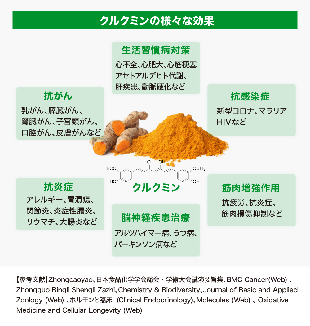 一方、クルクミンはウコンに含まれる有効成分のひとつですが、体内の様々な炎症を抑え、現代病を予防し健康を維持する効果があるとされており、その効果効能については、世界中で行われている数多くの研究で証明されています。