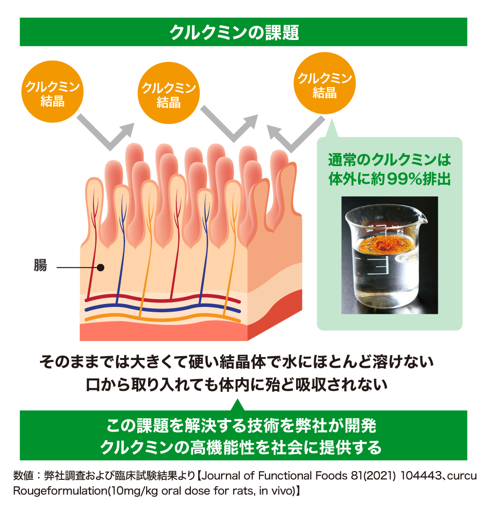 しかし、クルクミンは、ただウコンの粉末を口から摂取するだけではほとんど体に吸収されません。この課題を克服するため、弊社はクルクミンを吸収されやすくする独自の技術を開発し、機能性素材と医薬品研究開発という形で世の中に価値を還元しようとしています。