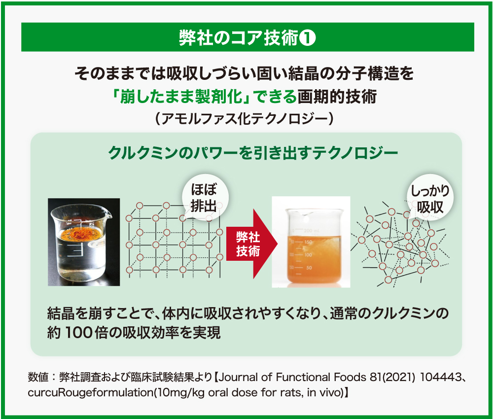 通常のクルクミンは、分子が規則正しく並び大きく硬い結晶体になっていて壊れにくくなっています。この結晶体の構造を崩してアモルファス(非晶質)にすることで、分子がバラバラになりやすく吸収されやすい状態にする画期的技術、アモルファス化テクノロジーを開発しました。