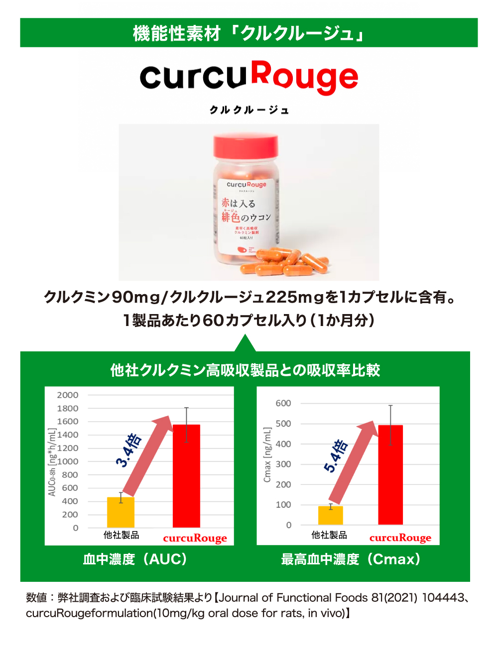 この技術を利用して開発されたのが、機能性素材「クルクルージュ」です。「クルクルージュ」の吸収率は通常のクルクミンと比較して約100倍、市販の高吸収品と比較しても5倍以上となっています。