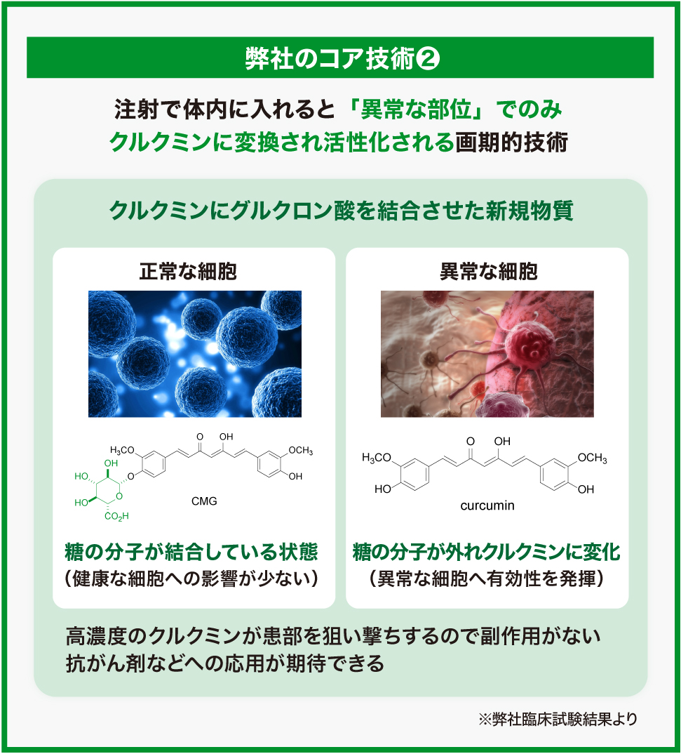 2.クルクミンに糖を合成して水に溶けるようにすることで、静脈注射による投与を可能にした(「TBP1901」に応用)