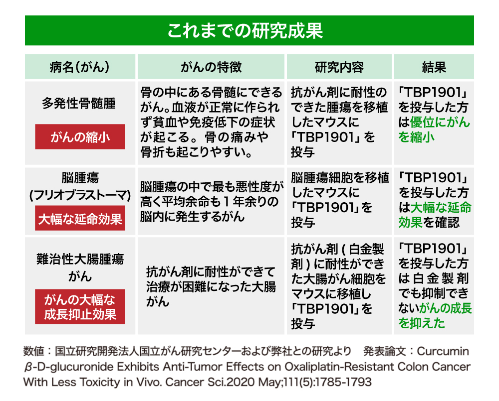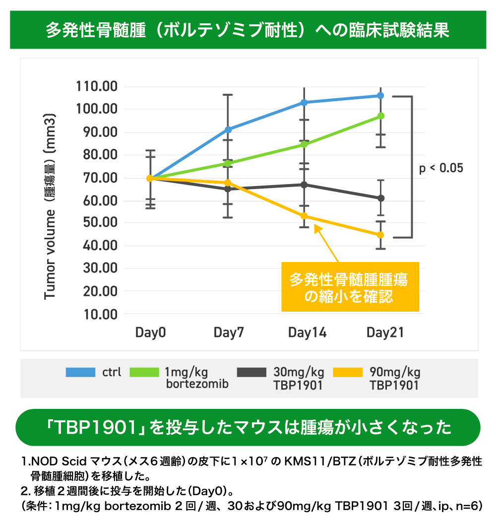 動物実験の段階ではありますが、骨髄のがんである多発性骨髄腫細胞を移植したマウスに「TBP1901」を投与したところ、腫瘍の縮小が見られました。そして、抗がん剤に耐性ができたがん細胞を移植したマウスに対しても効果が確認されています(研究結果一覧はこちらからご確認いただけます)。