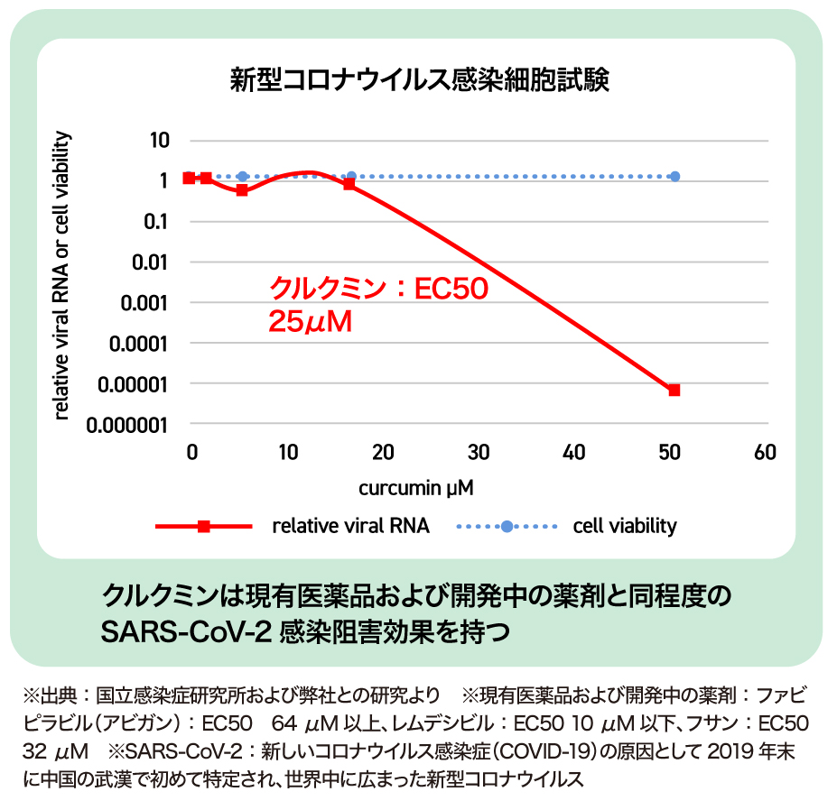 また、現在、新型コロナウイルス感染症の治療薬として用いられているもののなかにも、副作用のリスクが指摘されているものもあります。国立感染症研究所との共同研究では、クルクミンが現有医薬品および開発中の薬剤と同程度の感染阻害効果を持つことが示されました。その結果を得て、副作用のない新型コロナ治療薬としても活用していただけるように研究を進めています。