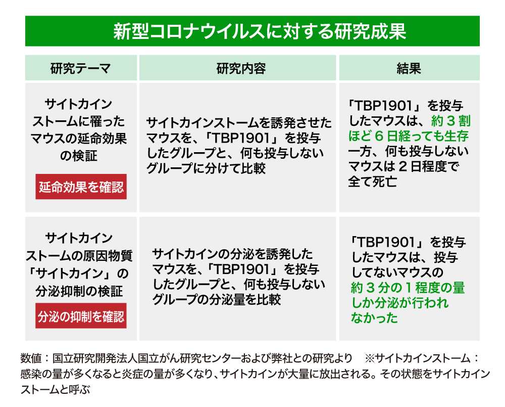 また、新型コロナウイルス感染症に対しては、「TBP1901」が細胞内へのウイルス侵入阻止・ウイルスの増殖阻止・炎症の緩和の作用があることが、マウスによる研究で確認されています。