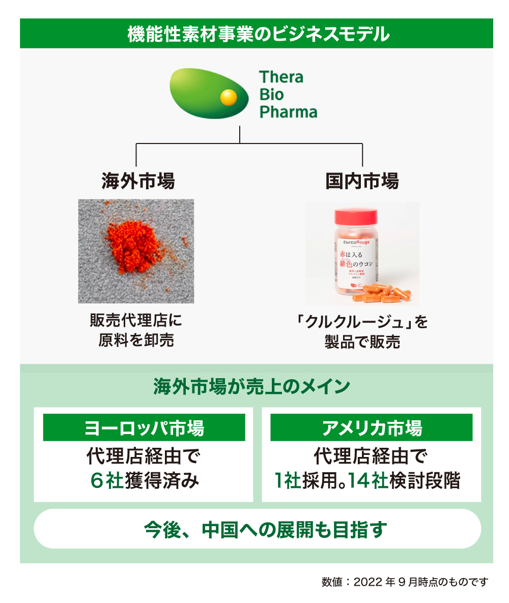 【機能性素材事業】ヨーロッパ市場の開拓は、専属代理店であるフランスの大手企業を通じてサプリメントメーカーへ拡販中で、現在、フランスやドイツの6社が既に販売中です。今年度は、アメリカ市場に本格的に参入する計画です。既に1社が採用を決め、14社のサプリメント企業が採用を前提に検討しています。その他の地域でも2社採用企業があります。また、海外での事業拡大のために必要な臨床試験の実施を計画しています。