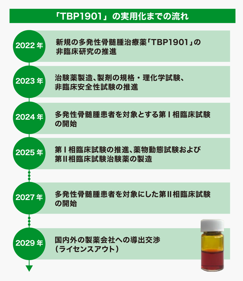【医薬品研究開発事業】多発性骨髄腫患者を対象にした第Ⅱ相臨床試験を実施し、有効性や安全性の確認、また臨床用量や用法の決定を目指します。また、「TBP1901」は薬剤耐性大腸がんや神経膠芽腫などの難治性がんに対する有効性も期待できるため、そのような患者を対象に臨床試験を計画し、適応拡大を目指します。