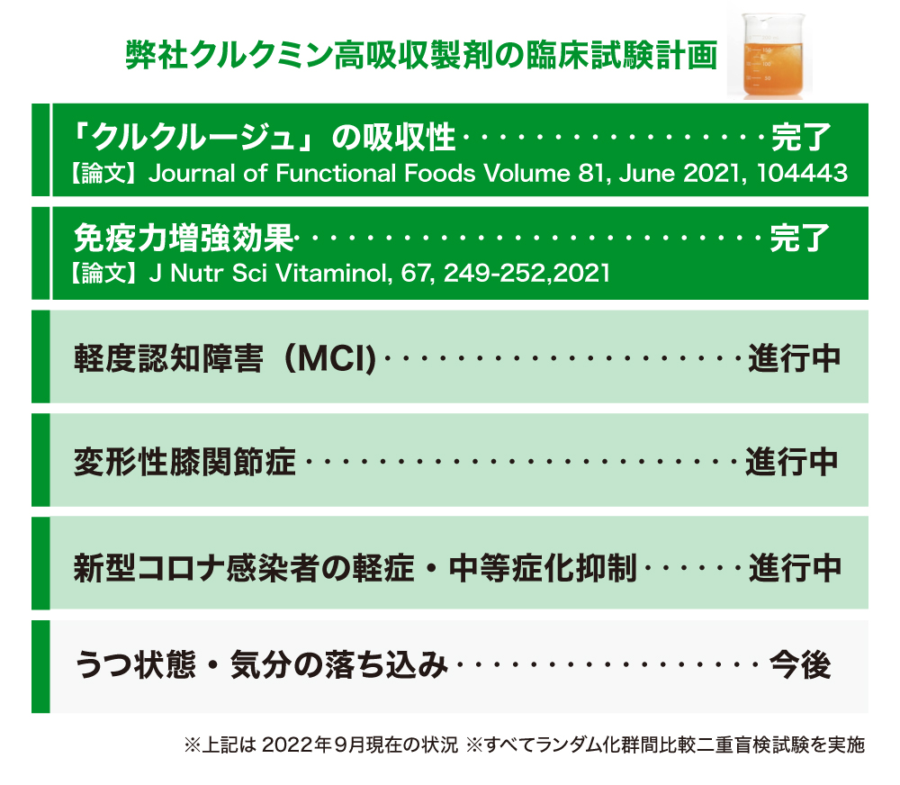 「クルクルージュ」において、2020年3月から様々な臨床試験を実施しており、良い結果が得られれば世界中の人達の健康と豊かな生活に大きく貢献できると考えています。また、「TBP1901」においては、クルクミンの免疫機能正常化作用は、新型コロナの発症抑制や重症化予防にも効果があると考えられており、マウスによる研究では一定の効果が見られました。