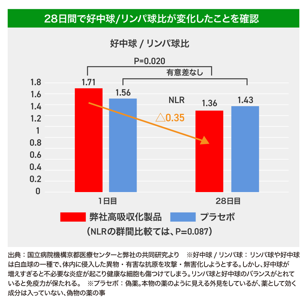 好中球数/リンパ球数の比率は、がん、感染症、心血管疾患など、加齢に伴う様々な病気の重症化や死亡の、大変重要な指標です。他の素材では見られない作用で、加齢に伴う様々な体調の変化に応用が可能な優れたサプリメントとして期待しています。