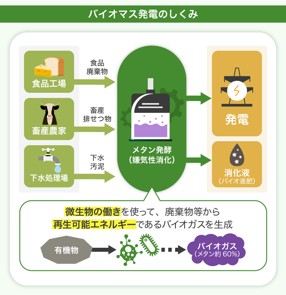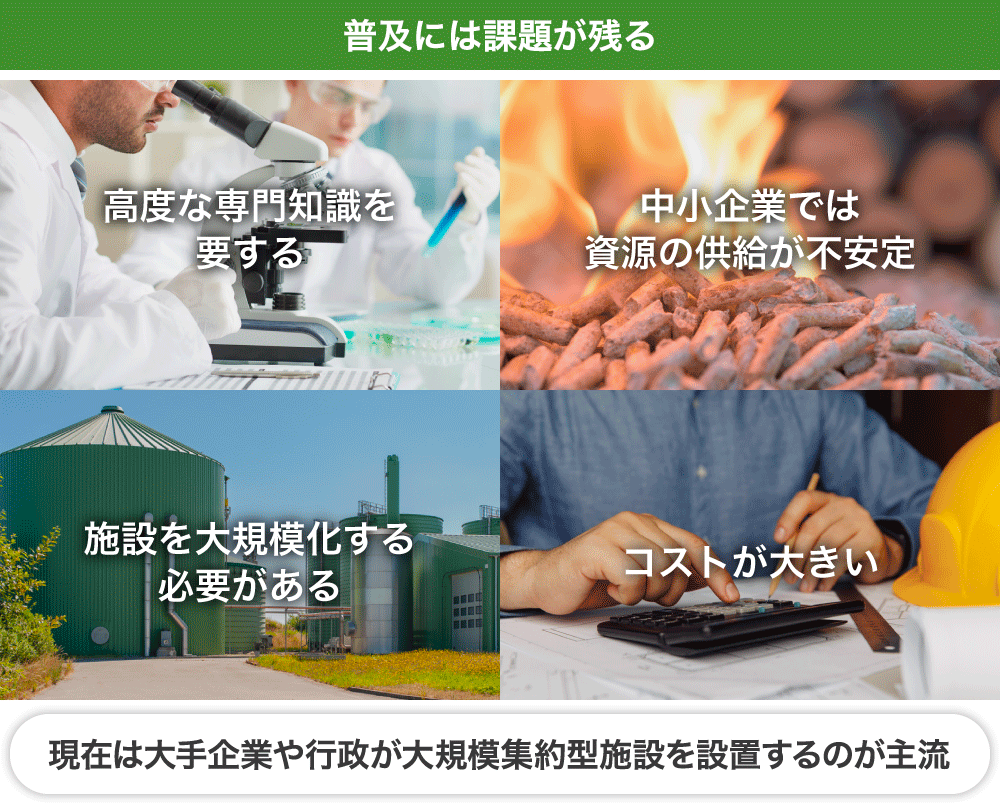 その他にも、周辺環境に適した施設の設計、バイオガスを回収した後の消化液の処理など、バイオマス発電施設の設置にはさまざまな壁があります。そのため、現状は大手企業や行政がスケールメリットを活かせる大規模集約型施設を設置するのが主流です。