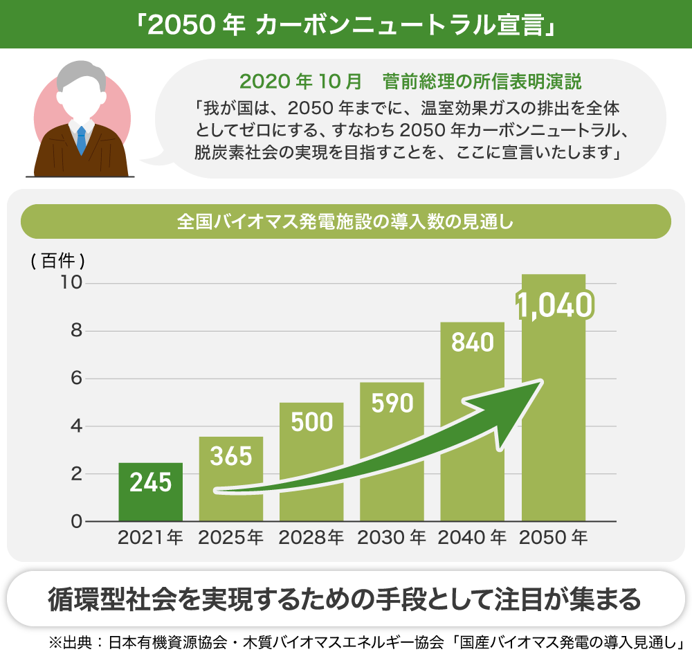 政府による「2050年 カーボンニュートラル宣言」の影響もあり、現在あらゆる業界が循環型社会の実現に向けてさまざまな活動を実践しています。中でも、食品廃棄物や畜産排せつ物などの生物資源(以下、バイオマス)を原料に、微生物群の作用により発生させたメタンガスを含むバイオガスを回収しエネルギー資源として活用する「バイオマス発電」は、この循環型社会を実現するための手段として期待が寄せられている技術です。全国のバイオマス発電施設の導入状況は2021年度の245件から、2050年度には1,040件程度まで増加すると見込まれています。