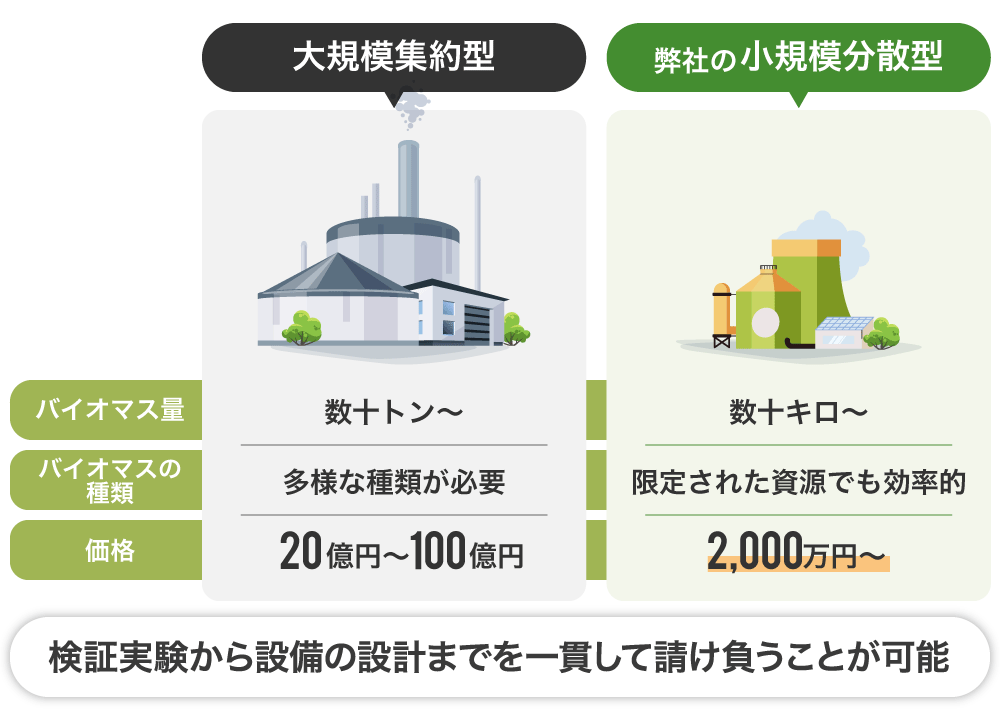 しかし、バイオマスを活用した循環型社会の実現のためには、日本の生産活動を支える中小企業こそ導入が必要です。そのためにも、低コストで運用できる小規模分散型施設が求められていると弊社は考えています。