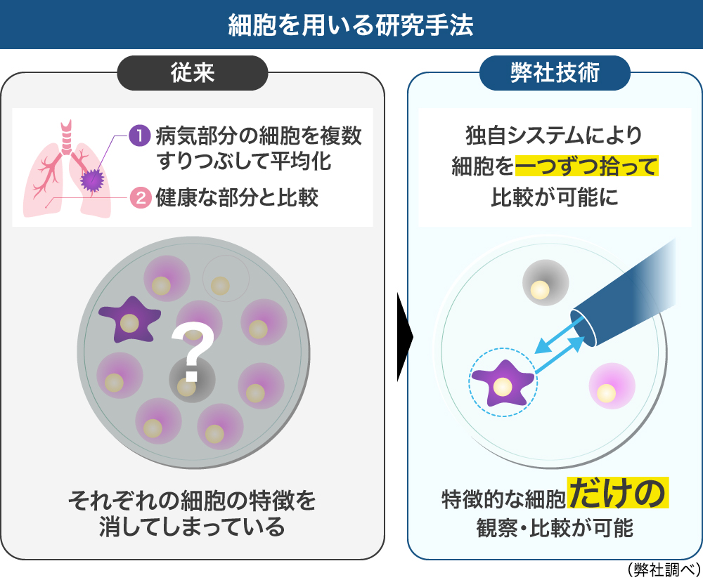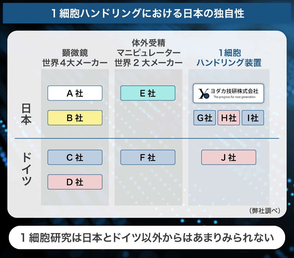 このような1細胞を拾う発想は元々、顕微鏡や体外受精用マニピュレーター(人が操作する医療用装置)の技術が根底にあり、歴史的に日本の独自性が高いため他国に真似されにくいと考えています。