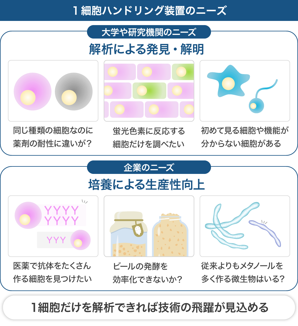 1細胞を拾いたいというニーズは非常に多くありますが、1個拾って解析をしたいアカデミアのニーズと1個拾って培養したい企業のニーズとに分かれます。