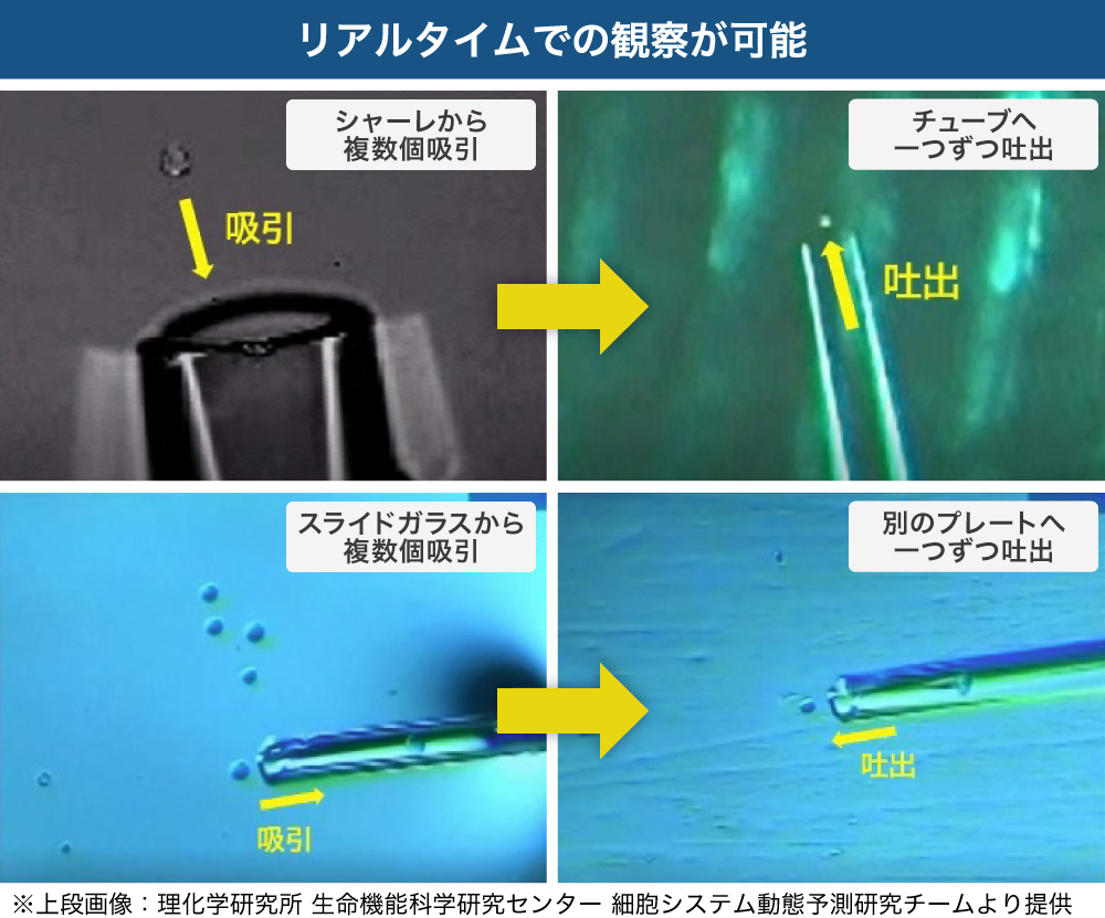 超微小液量操作は生物体を構成する化合物のほとんどが液体であることから、高感度化、省力化において非常に重要です。その中でも細胞を1個ずつ顕微鏡下で拾い上げる技術は従来行われてきたバイオ研究から飛躍的に精度の高い結果をもたらす技術となりえると考えています。