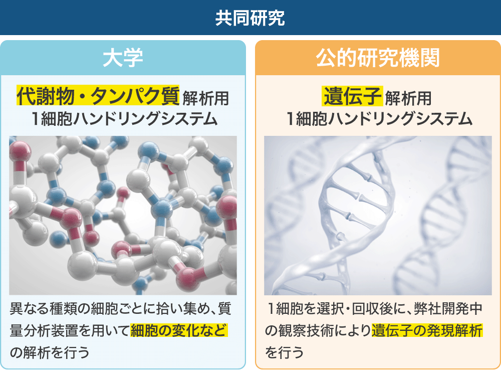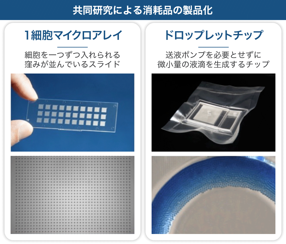 また、1細胞ハンドリングと相性の良いマイクロデバイスの共同開発を公的研究機関や大学などの各機関と行い、製品化につなげております。