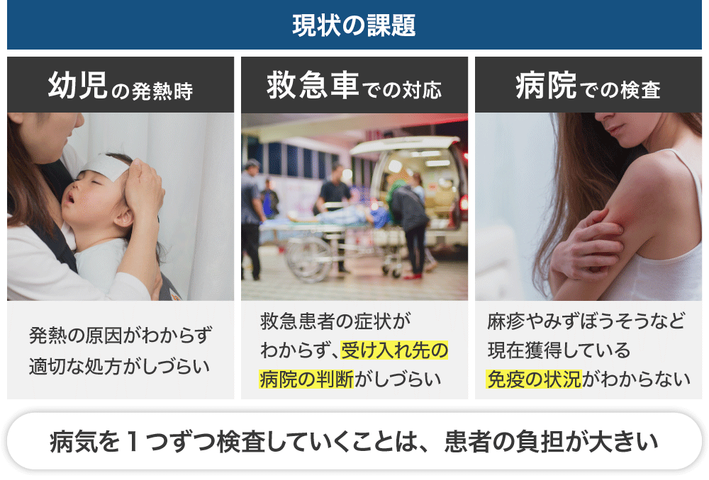 現在、発熱時の迅速な病気の確定診断は、インフルエンザと溶連菌のキット、あるいは新型コロナウイルスのキットを用いるくらいですが、検出感度が低いためインフルエンザの時は発熱してから半日以上経ってからクリニックに来るように言われています。コロナウイルスにおいては、ワクチンを打っても免疫機能が数ヶ月で低下するなど、免疫機能は個人差だけではなく時間でも変化が大きいことが推測されています。しかしながら、このような発熱時にはしかや風疹など病気のキットを1つずつ検査していくことは、患者の負担が大きく現実的ではありません。