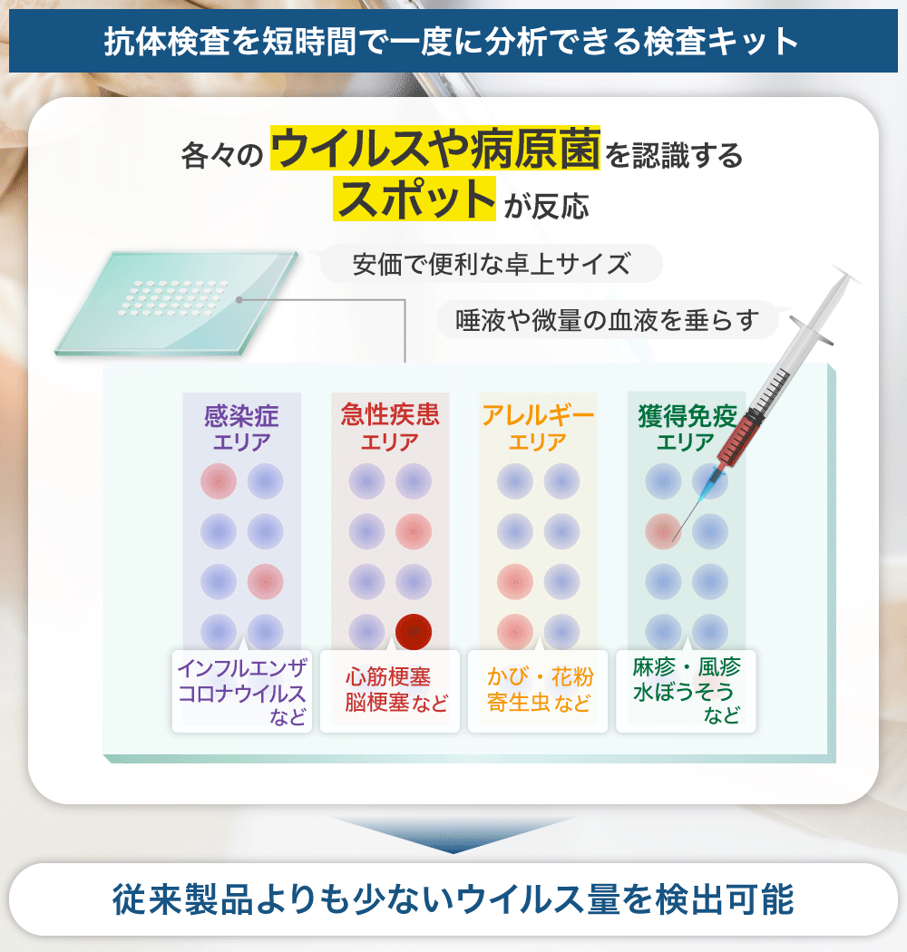 そこで弊社は、数十種類の抗体検査を一度に短時間で分析することが可能な、卓上サイズの装置とキットの開発を進めています。このようなキットは、救急患者の急性疾患の判定やアレルギー判定、あるいは自分が現在どのような免疫を獲得しているかなども分かるようになります。