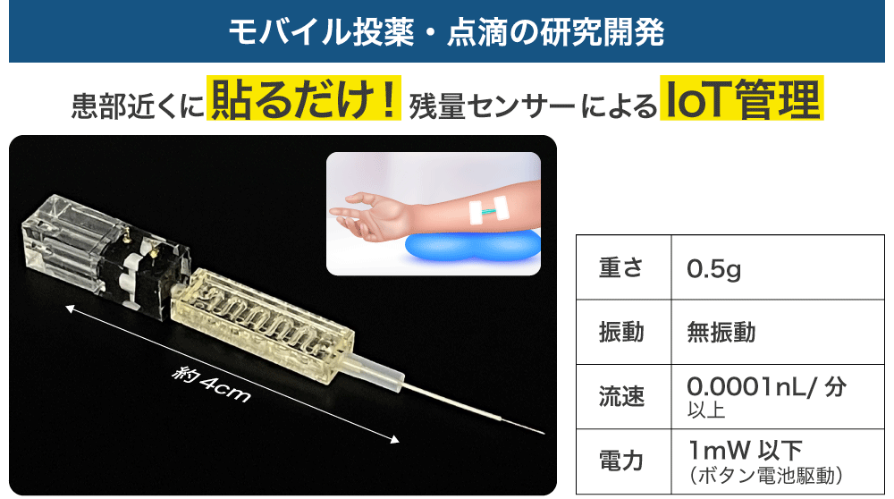 現在、アットドウス株式会社を通じて大学などと共同で、モバイル投薬・点滴デバイスの研究開発を行っています。薬といえば、通常は口から飲むことが一般的です。全身にわたる症状(感染症など)に関しては効果的ですが、患部が局所(がんや臓器の疾患など)の場合、そこに届くまでに相当量の薬が患部以外に反応していると考えられます。