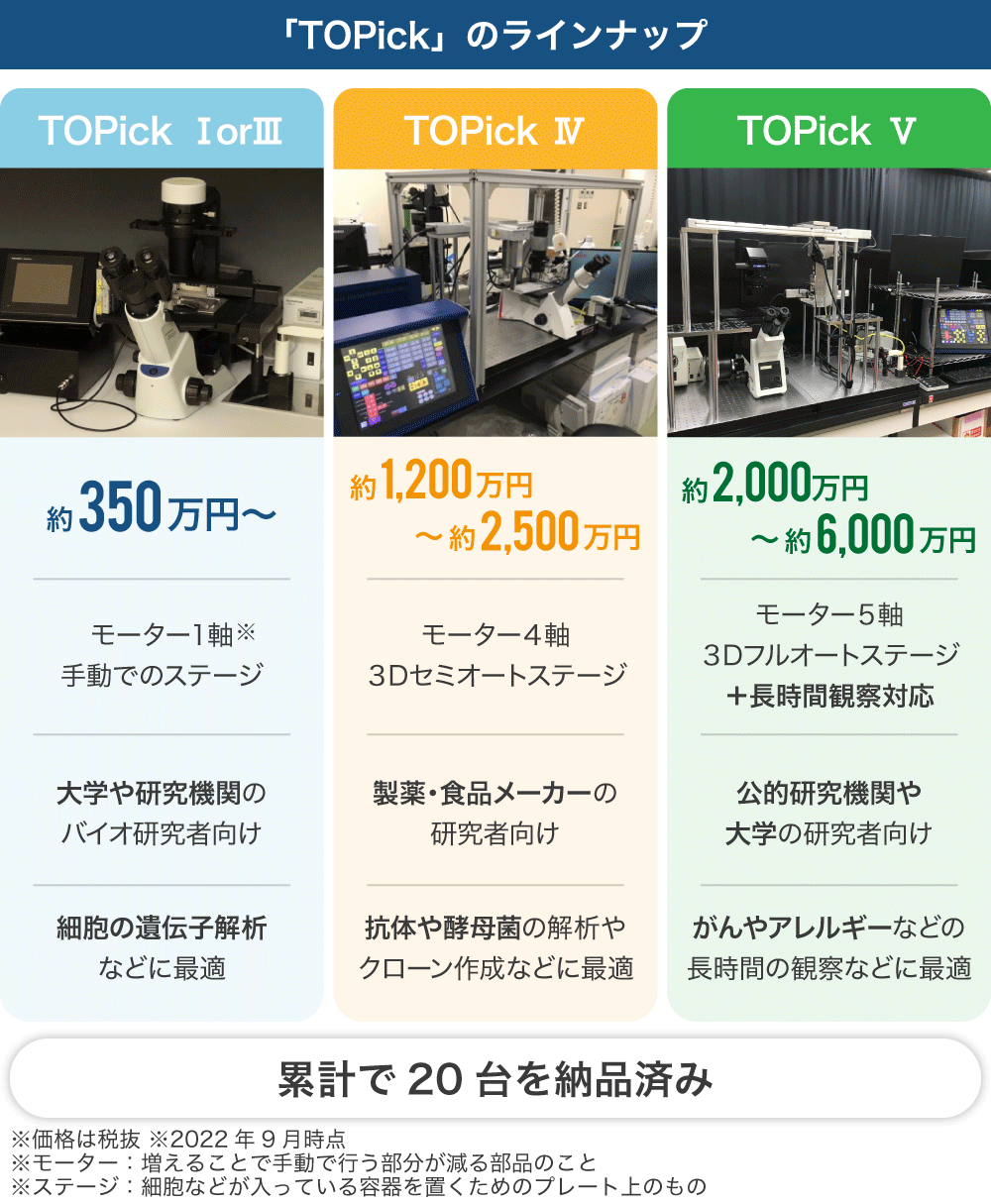 大学や公的研究機関などの共同研究先を中心に1細胞ハンドリングシステムをそれぞれのニーズに合わせてカスタマイズし導入をしてきました。2022年9月時点では、大型の装置(約2,000万円〜)を8台、標準装置の改良版(約350万円〜)を12台納品しています。