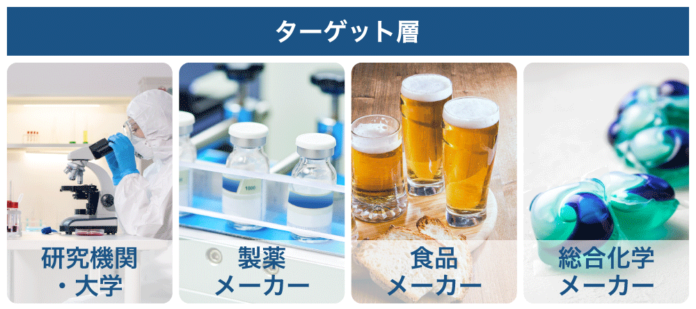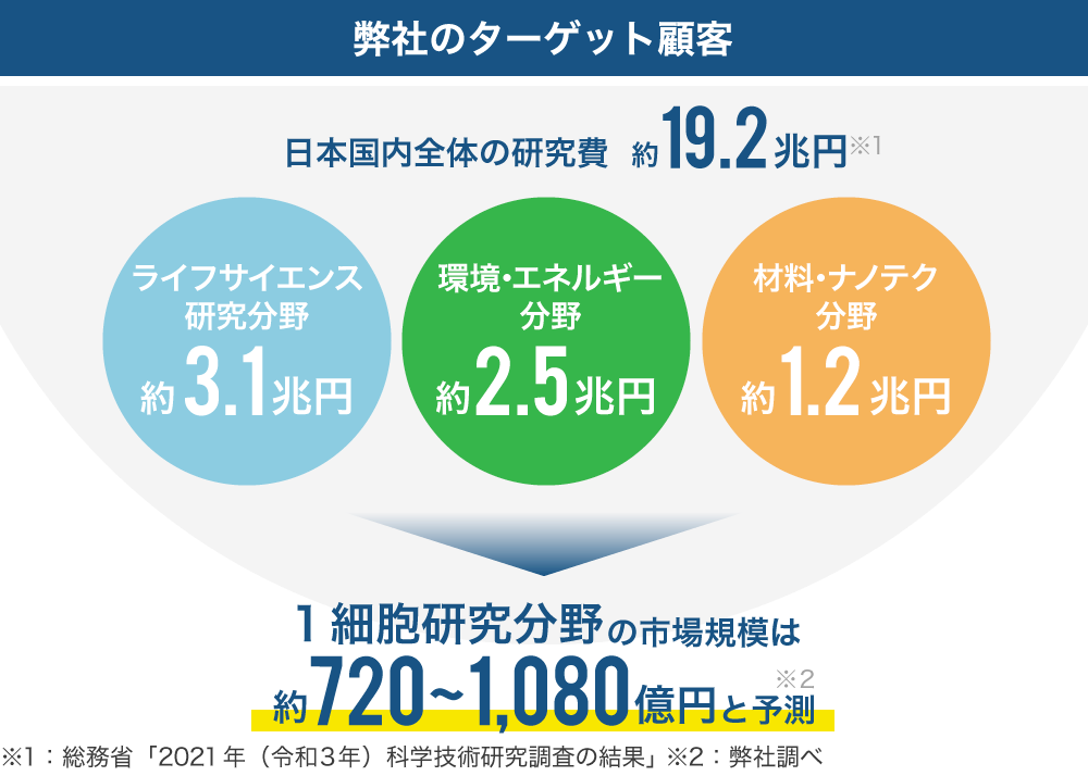 総務省によると、日本国内全体の研究費市場は約19.2兆円あり、そのうちライフサイエンス研究分野の研究費が約3.1兆円と最も多く、主に製薬企業がこれをけん引しています。これに加えて、環境・エネルギー分野の約2.5兆円、材料・ナノテク分野の約1.2兆円市場が弊社のターゲット顧客となります。