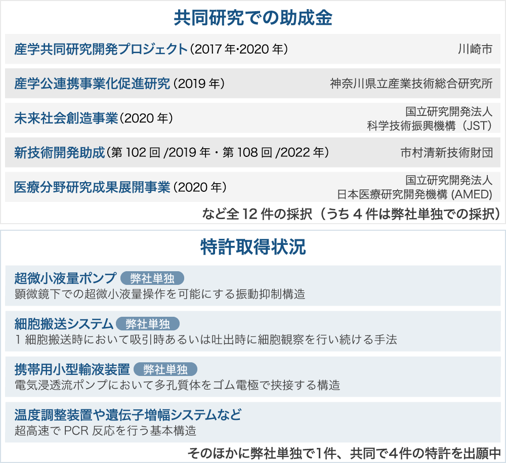 弊社は、創業時から大学や公的研究機関と共同して、国や自治体、財団などの助成金を積極的に活用し、開発を加速してきました。現在は、弊社単独で3件、共同では1件の特許を取得しています。また、弊社単独で1件、共同では4件の特許を出願中です。
