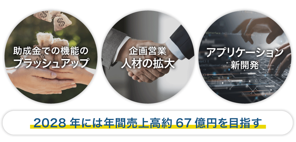 「サービス企画営業」は、既に完成した装置を用いた新しいアプリケーション(応用)開発に注力し、これにより装置の応用範囲を広げていきたいと考えています。このような独自の技術営業体系を構築し、2028年9月期には年間売上高約67億円を目指します。
