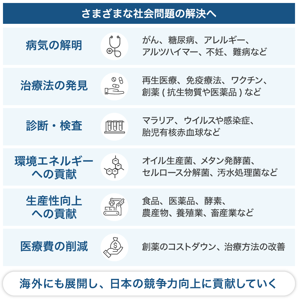 1細胞研究は、社会問題の根本的な解決につながると考えます。例えば、がん・アルツハイマー・糖尿病などのメカニズム解明、あるいは有用微生物を発見し、新しい創薬・食品の開発からエネルギー問題解決まで、さまざまな分野での貢献が期待できます。弊社の1細胞ハンドリングを基盤とし、国内の企業や大学の研究者等が先端分野で世界をリードする未来を目指し、日本の競争力向上に貢献していく考えです。