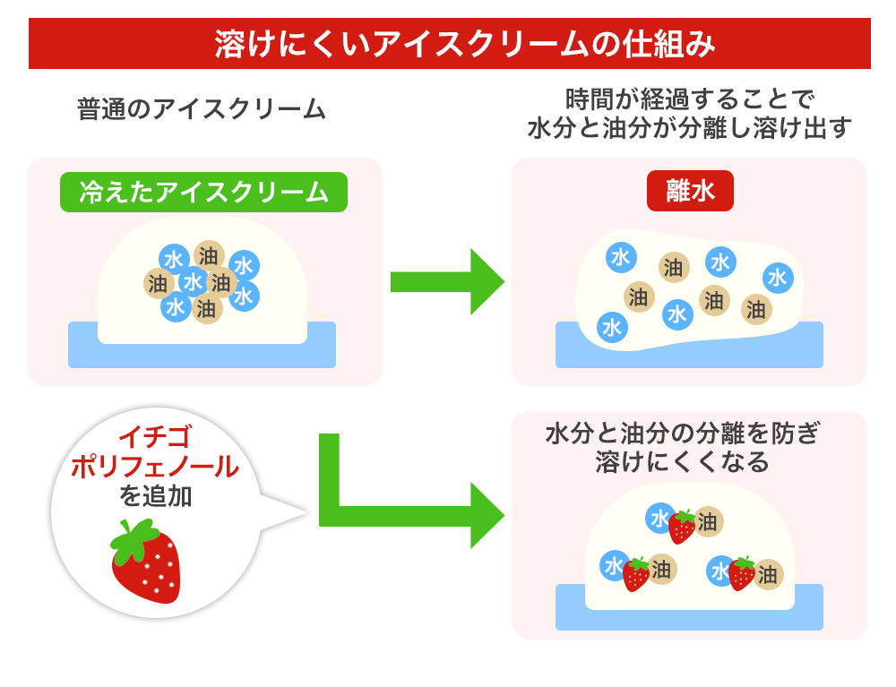 生クリームの保形性を向上させるのであれば、アイスクリームではどうなるのか検証したところ、同じくアイスクリームが溶けにくくなることを発見しました。