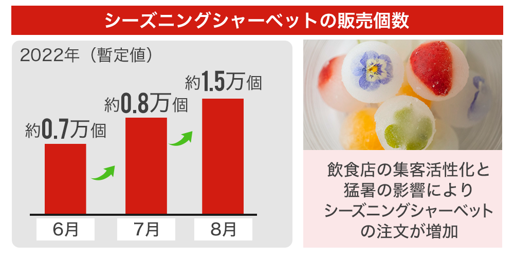 特に、弊社の主力商品である飲食店向けのドリンク用ボールアイス「シーズニングシャーベット(2022年4月から弊社オリジナル商品として新発売)」は順調に出荷量を増やしています。