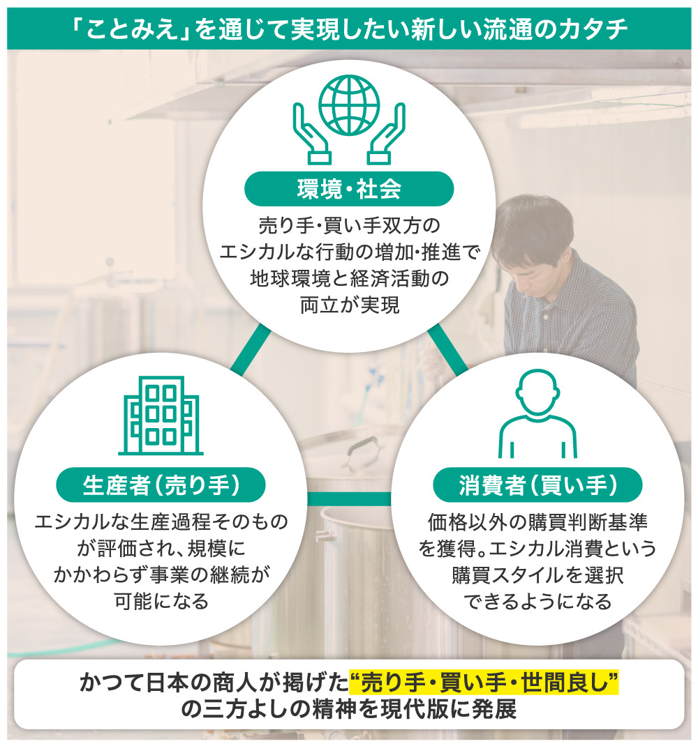 「ことみえ」を通じて、既存の「モノ」情報にプラスされた「コト」情報のストーリー性によって、日本に元々ある「売り手よし・買い手よし・世間よし」の三方よしの流通のカタチを世界に提供していきたいと考えています。