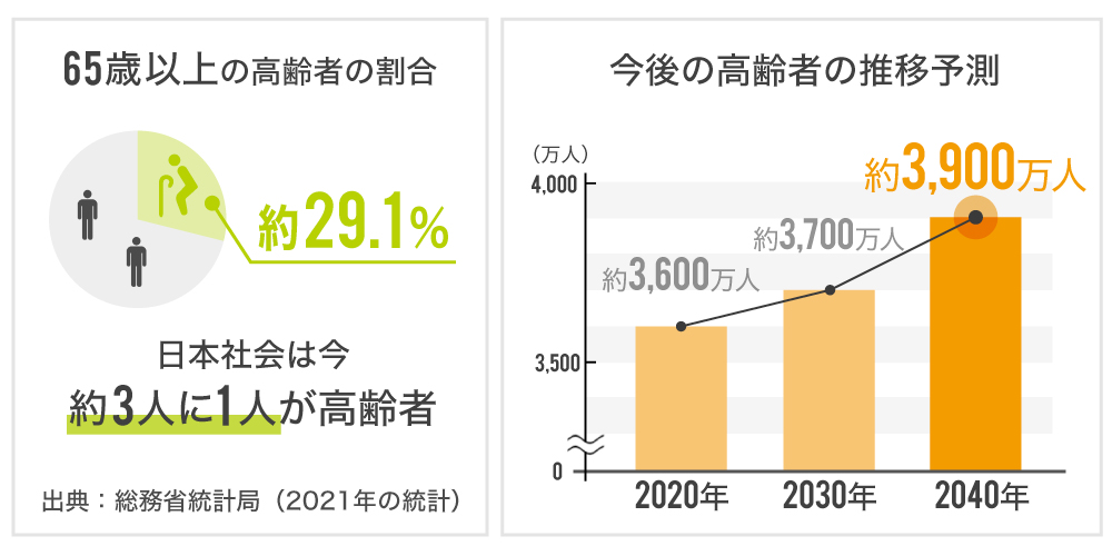 日本の総人口のうち、65歳以上の高齢者の割合は約29.1%(出典:総務省統計局 2021年)で、約3人に1人が高齢者と言われるほどの超高齢社会です。
