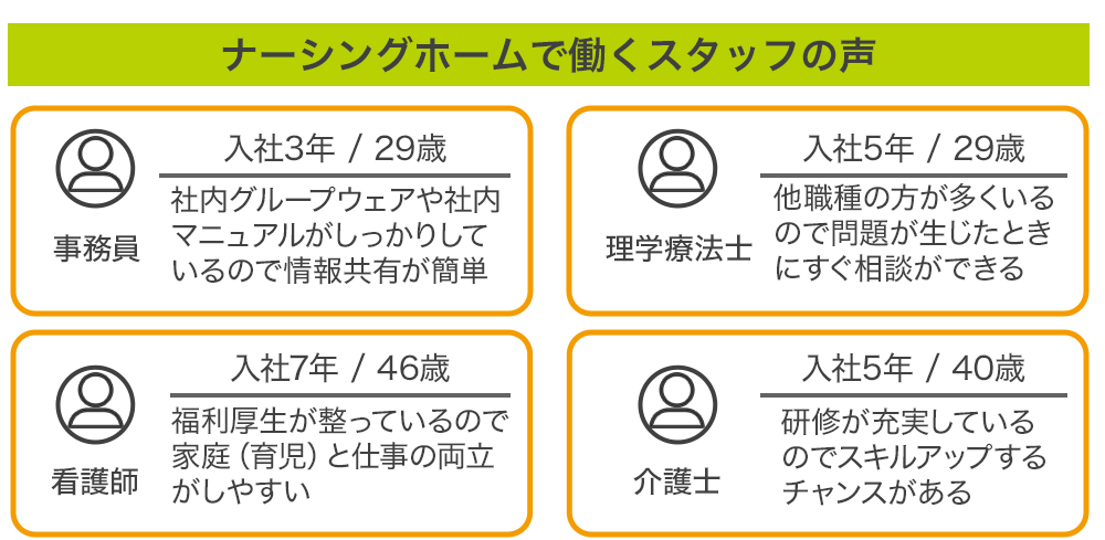 また、年齢や性別、専門職員が偏らないよう、介護士だけでなく、看護師や理学療法士などあらゆる専門職員をバランスよく採用しています。