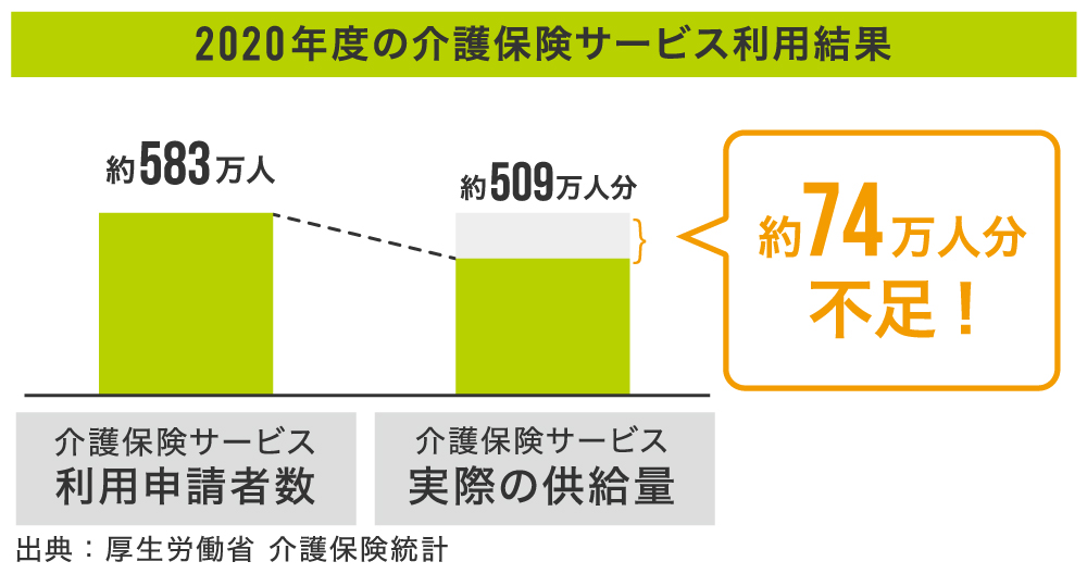 それに伴い、全国の介護保険サービス(在宅・居住施設含め)利用者数は、2020年度で約583万人、2000年度から比較して20年間で約3.1倍も増加しています。一方、介護保険サービス供給量は2020年度で約509万人分と需要に対して不足している状況です(出典:厚生労働省)。