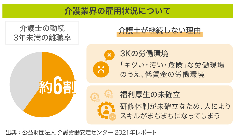 介護業界では社員教育、福利厚生への投資は後回しにされがちで、そのために優秀な社員が育ちにくく、業界全体で入社後3年以内の離職率が約6割と定着しづらい環境にあります(出典:厚生労働省)。