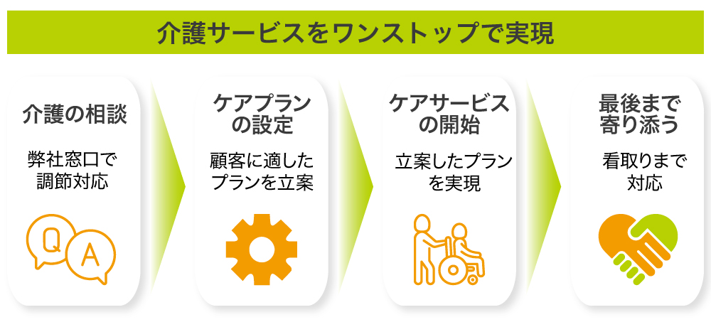 そこで弊社は、生活をしていくうえで介護が必要になった際にその時々で本当に必要とするサービスをすぐに受けられるよう、介護保険の相談から訪問介護の実施や老人ホームへの入所など、介護サービス全般をワンストップで提供しています。