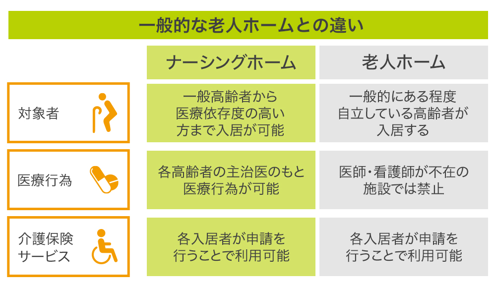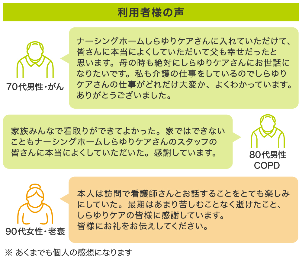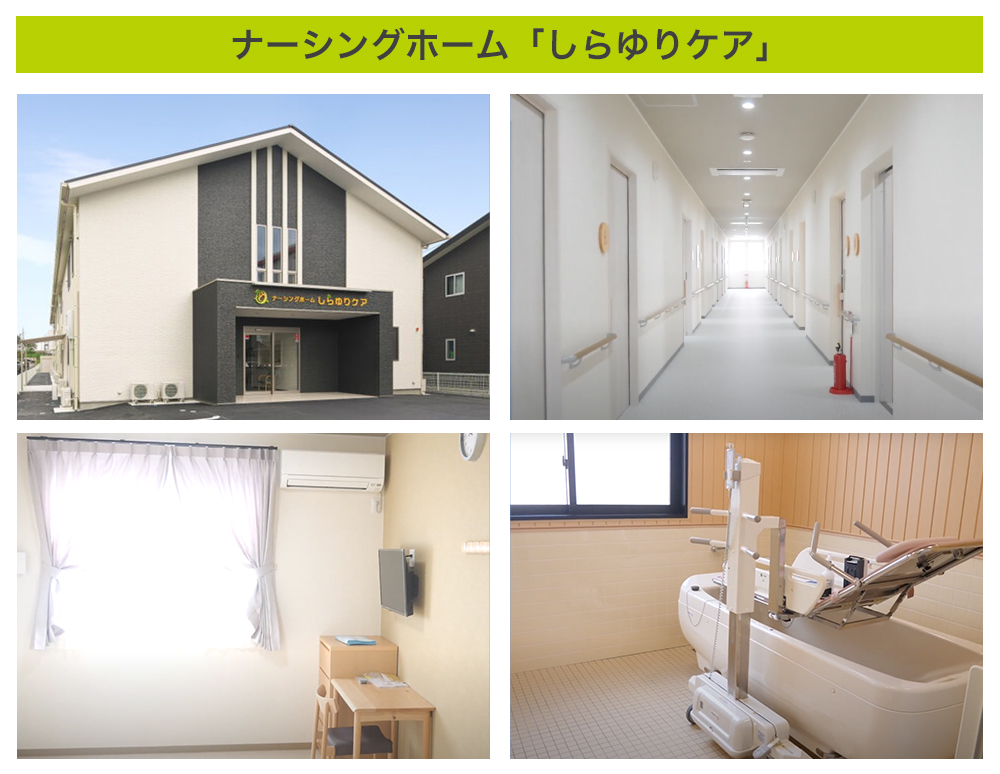 弊社が今特に注力して運営しているナーシングホーム「しらゆりケア」は、アメリカの介護サービスを起源としたもので、通常の老人ホーム(居住型老人福祉施設)に加えて、看護師が24時間滞在し、主治医の指示のもと医療行為を提供する新しい形の老人ホームのことです。新たな”終の住処”として多くの方にご利用いただいています。