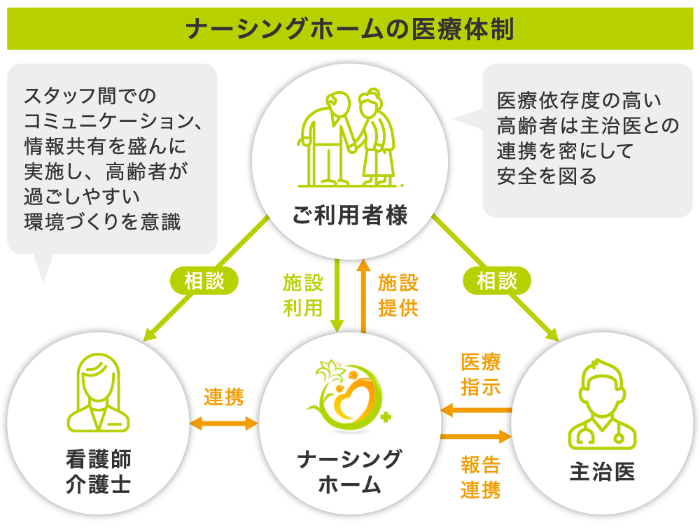 さらに、施設に看護師がいるだけでは急変時の医療行為はできませんが、弊社のナーシングホームでは常に主治医と24時間体制で連携しており、訪問看護指示を貰うことで急変時にもすぐに対応しています。