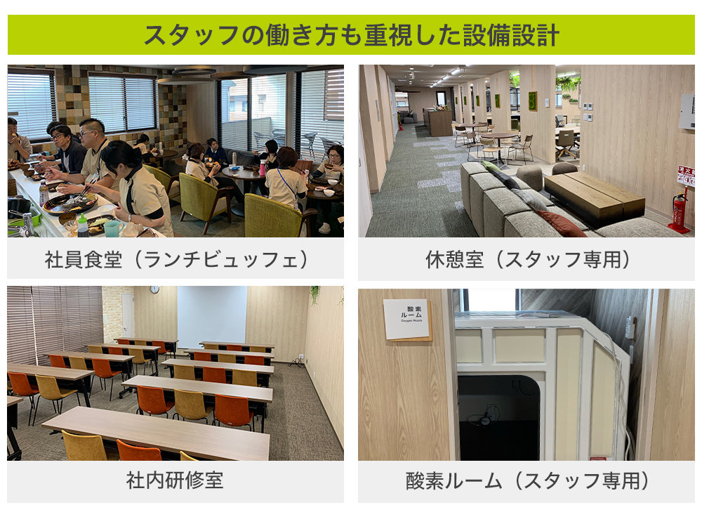 弊社では、スタッフが働きやすい環境を構築するための設備投資も大切にしています。広々とした休憩スペースに、全社員が利用できる無料ランチビュッフェ、それに定員40名の研修室に託児ルームや酸素ルームを設置したりと従来の介護事業所には珍しいと思われるスタッフ向けの社内設備を整えています。