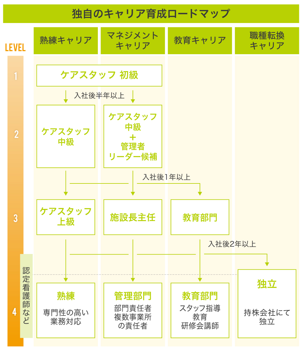 さらに、4段階に分けたキャリアアップに関するロードマップを独自制作して、介護士のキャリアアップを支援する仕組みを構築しています。